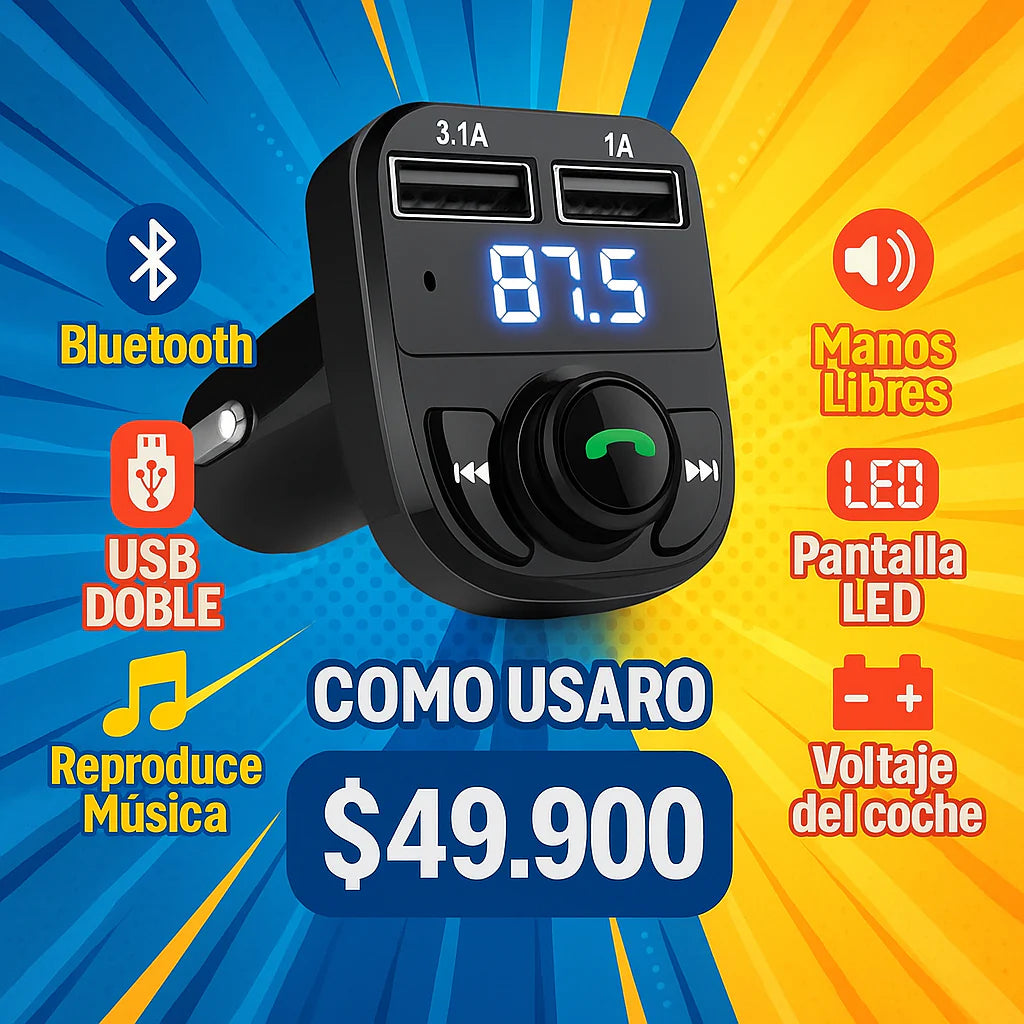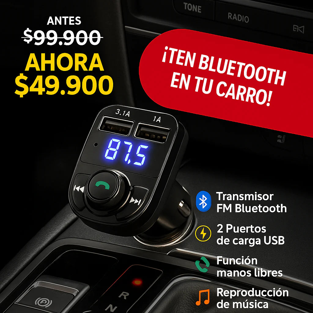 ¿Tu carro no tiene Bluetooth? ¡Ya no importa! Con nuestro transmisor, tendrás manos libres, música, carga rápida y todo desde un solo dispositivo. ¡Y por tiempo limitado a solo $49.900!