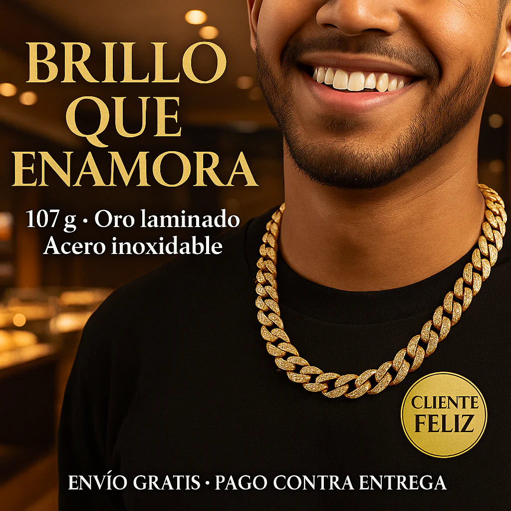 Porque combina acero inoxidable 100 % —resistente y cómodo para el uso diario— con un laminado en oro que realza un brillo premium sin el precio del oro macizo. Su peso real de 107 g y el grosor de 1,5 cm le dan una presencia que se nota en fotos, videos y en persona: cae con firmeza sobre el pecho y no se ve “liviana”. Además, personalizamos el largo (50 cm por defecto) para que te quede perfecta: solo deja tu medida al hacer el pedido. Es la pieza ideal para elevar un outfit básico o destacar en un evento, con un look elegante y moderno. Y para comprar sin fricciones: Envío gratis en Colombia y Pago contra entrega. Si buscas una cadena que imponga y mantenga su apariencia con cuidados simples, esta es.