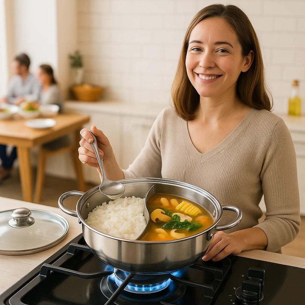 Es acero inoxidable (no antiadherente). Úsala para preparaciones líquidas (caldos, sopas, ramen, fondue). Cocina a fuego medio, con líquido suficiente y mezcla de vez en cuando.